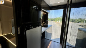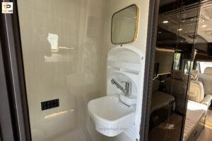 Phòng vệ sinh trên xe được thiết kế tuy tối giản nhưng rất thông minh. Xe sử dụng bồn cầu của hãng Thetford giúp tiết kiệm nước và ngăn ngừa mùi hôi rất hiệu quả. Hệ thống xả thải theo tiêu chuẩn châu Âu giúp việc đổ chất thải rất đơn giản chỉ với vài bước dễ dàng.